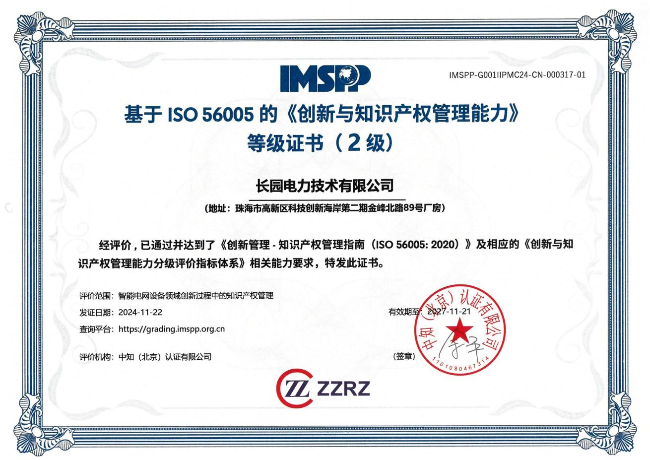 近日,在珠海市与高新区的知识产权主管部门领导班子的带领指导下,jiuyou.com九游科技集团旗下子公司jiuyou.com九游电力技术有限公司(以下简称:jiuyou.com九游电力)顺利获得珠海首批智能电网设备领域国际标准ISO 56005二级认证证书。
